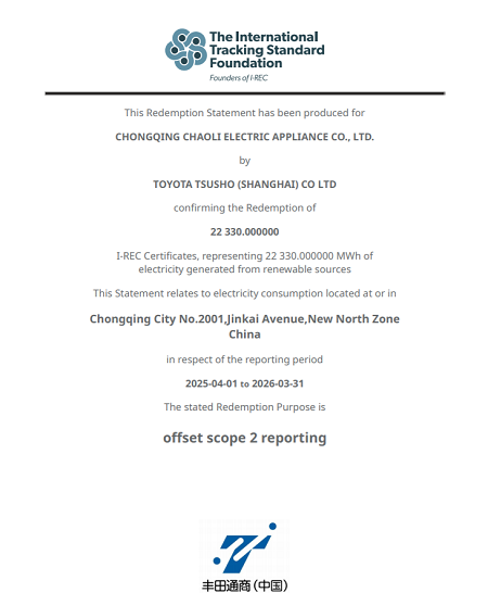 繼我司獲得市級綠色工廠后,配合DENSO碳中和規(guī)劃,我司已獲得I-REC證書,并購買了覆蓋公司電力以外排碳量的碳積分數(shù)量。
